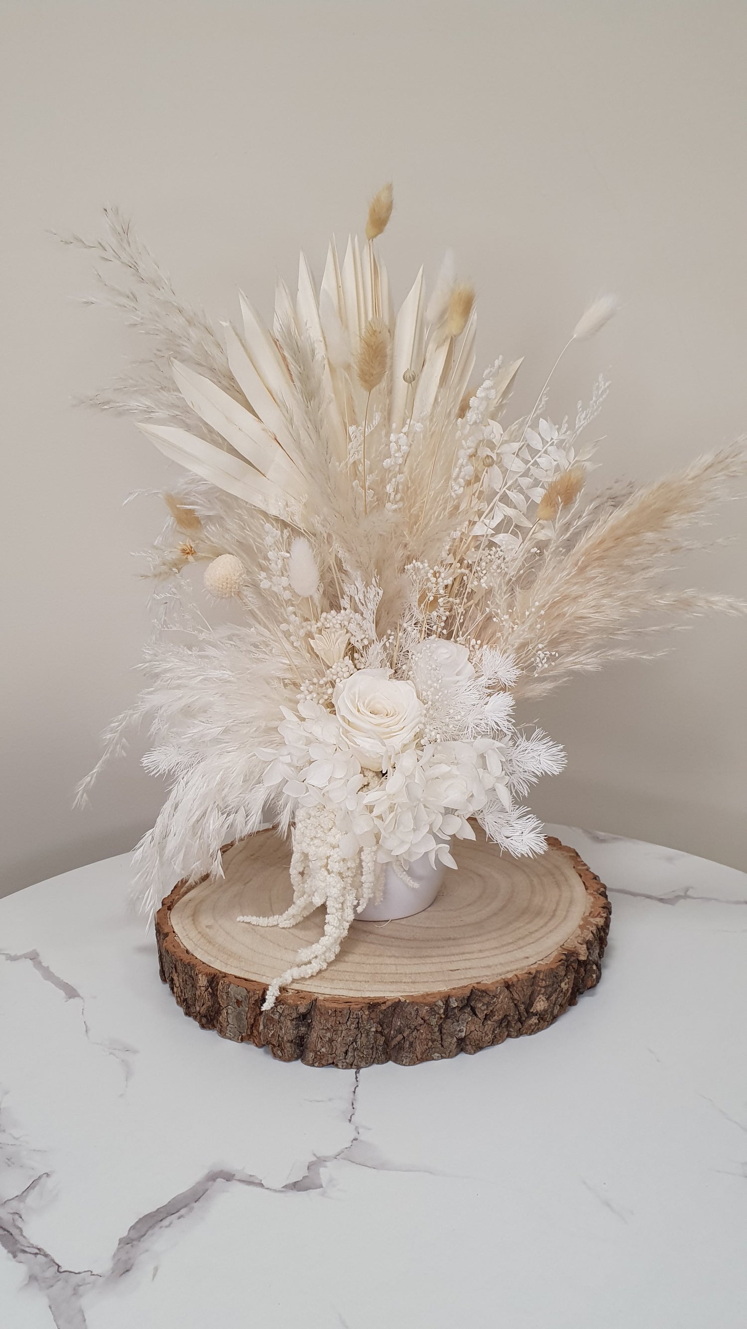 Add a touch of elegance and sophistication to your tables with our stunning wedding centrepieces featuring preserved, silk and dried flowers. Whether you prefer neutral pampas displays, rustic autumnal arrangements or gorgeous greenery, we have a variety of centrepieces to suit your taste.